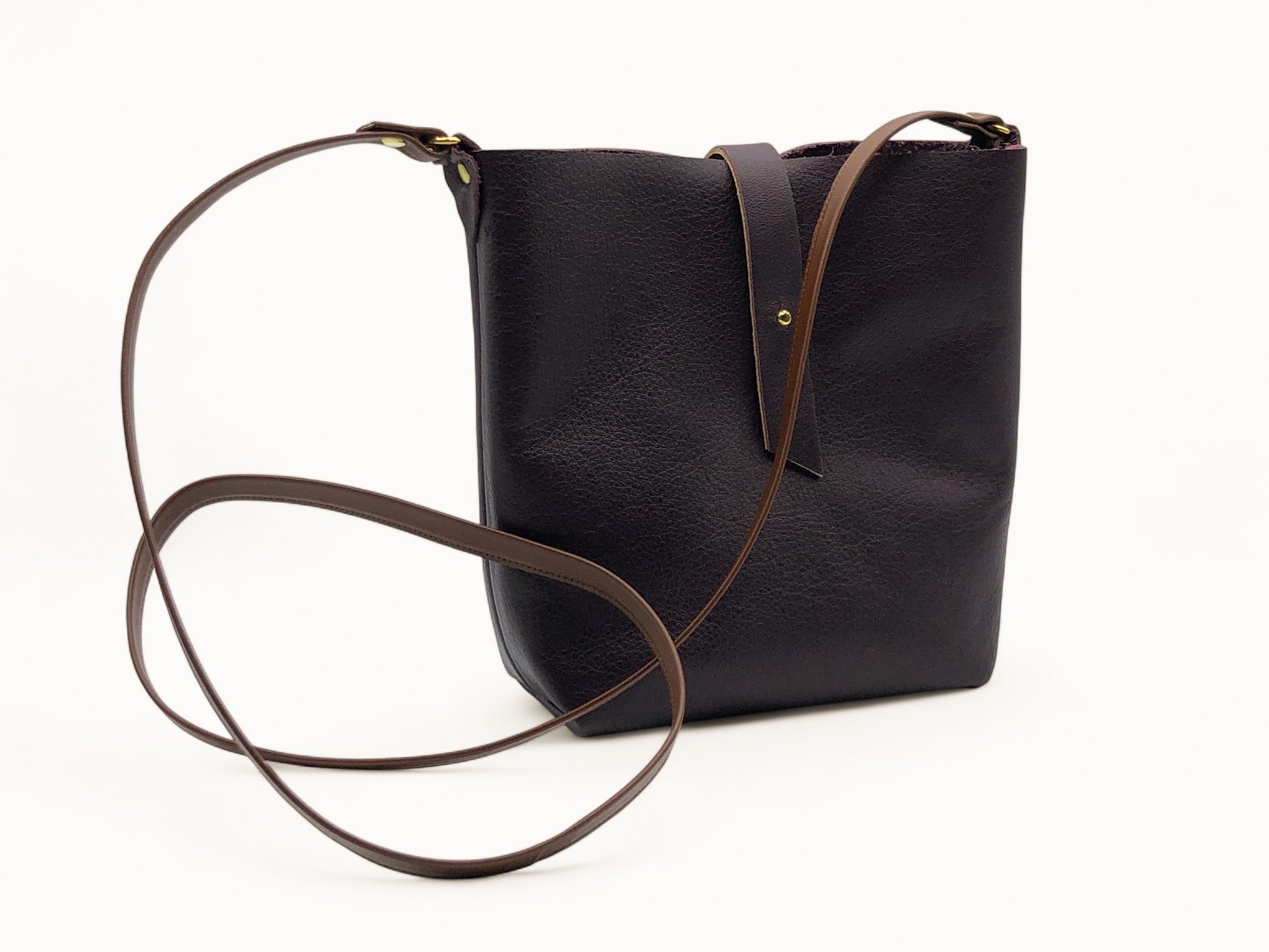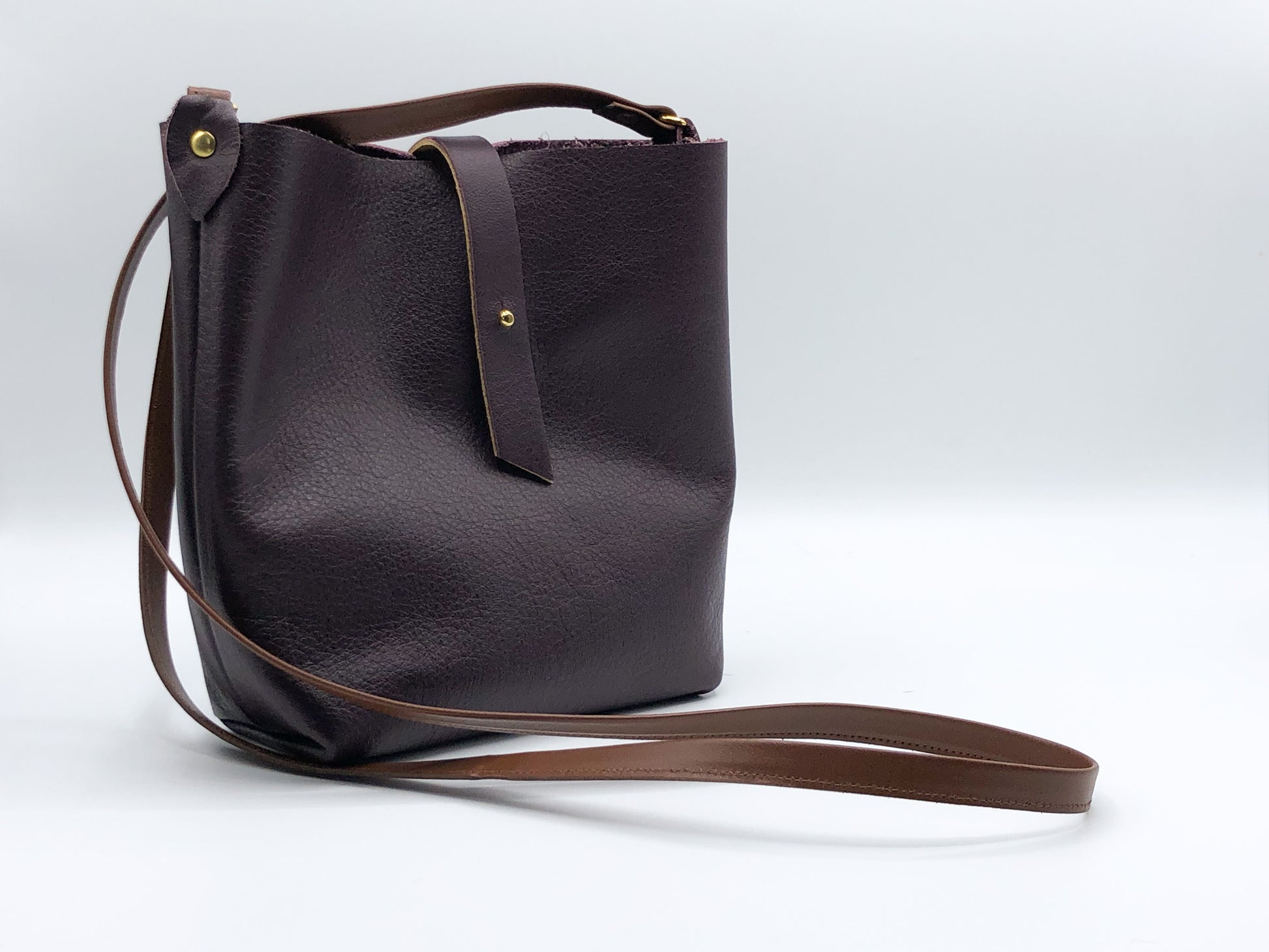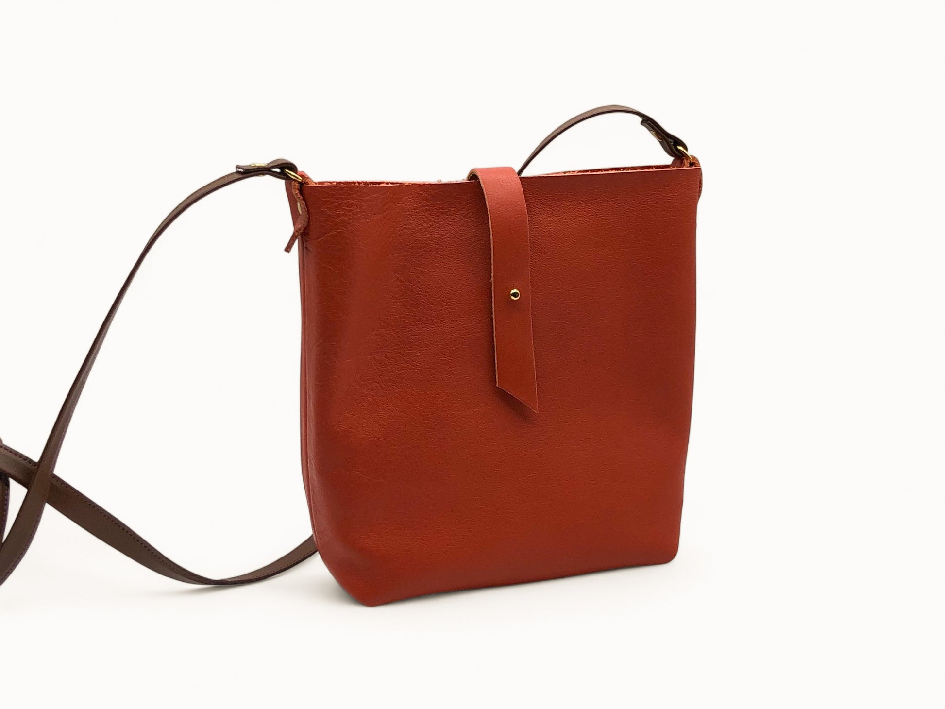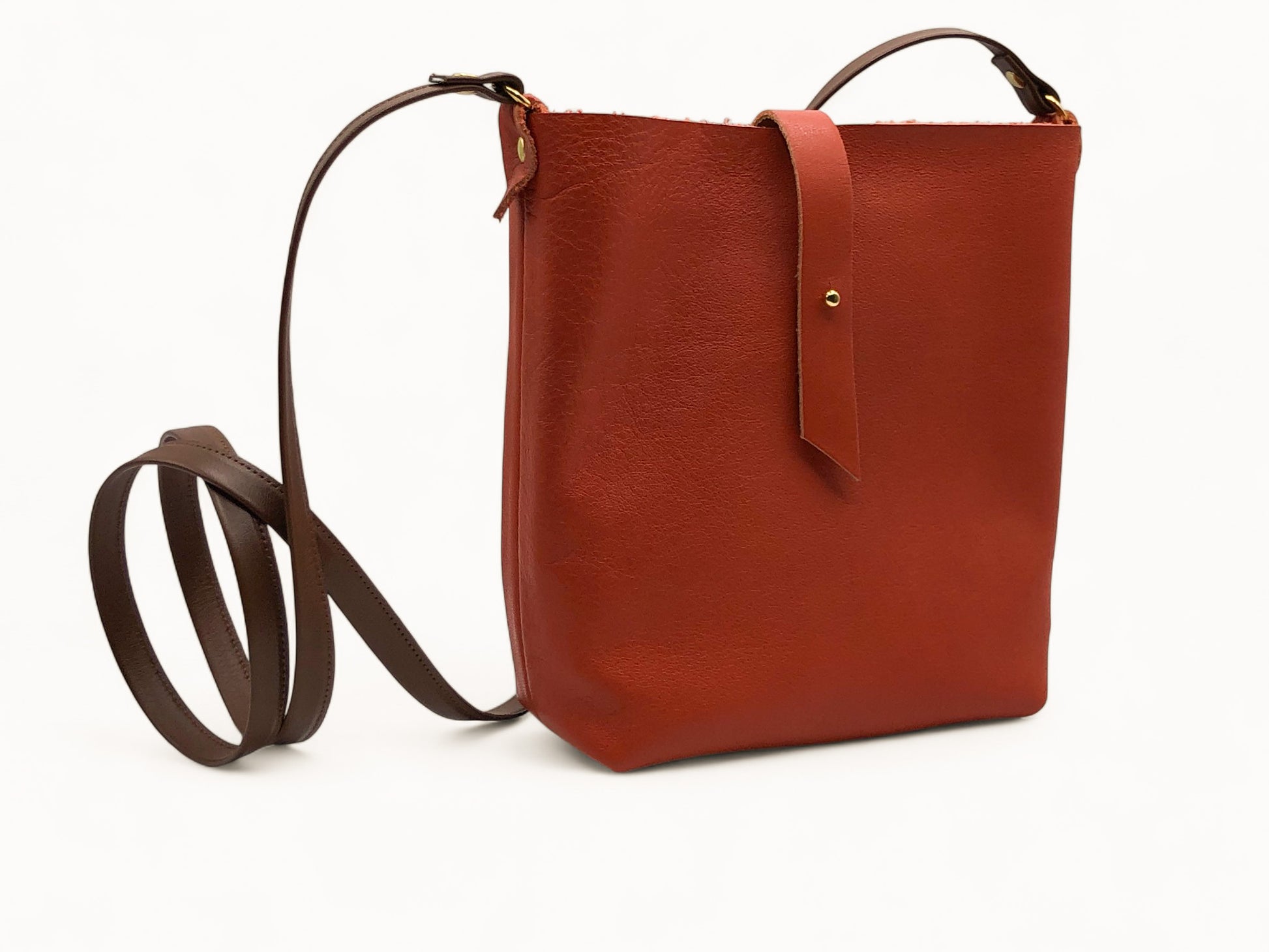 Borsa a tracolla semplice e minimale in nappa morbidissima sfoderata. Ha una tracolla in cuoio marrone e una chiusura fermata da un gemello.
