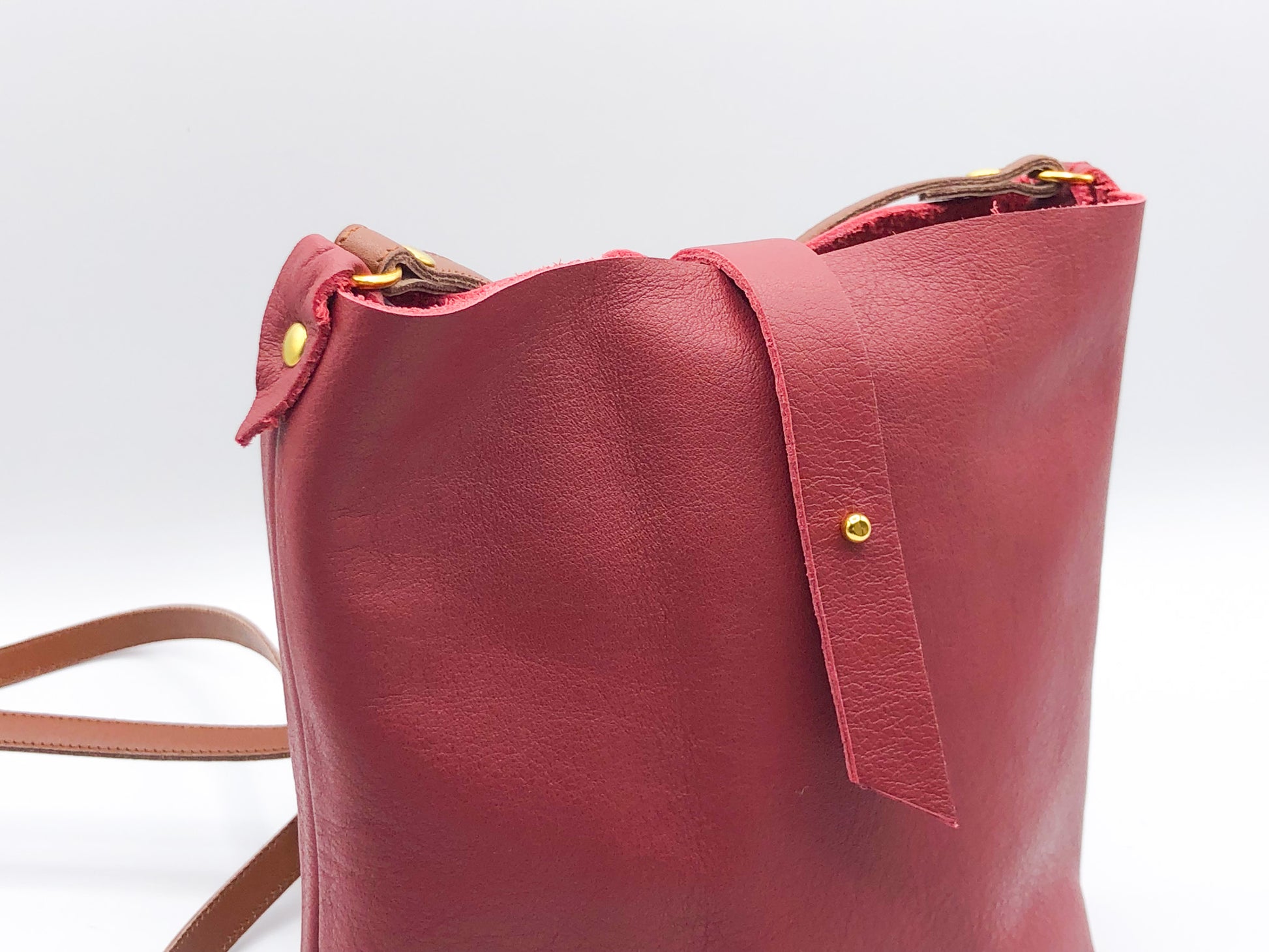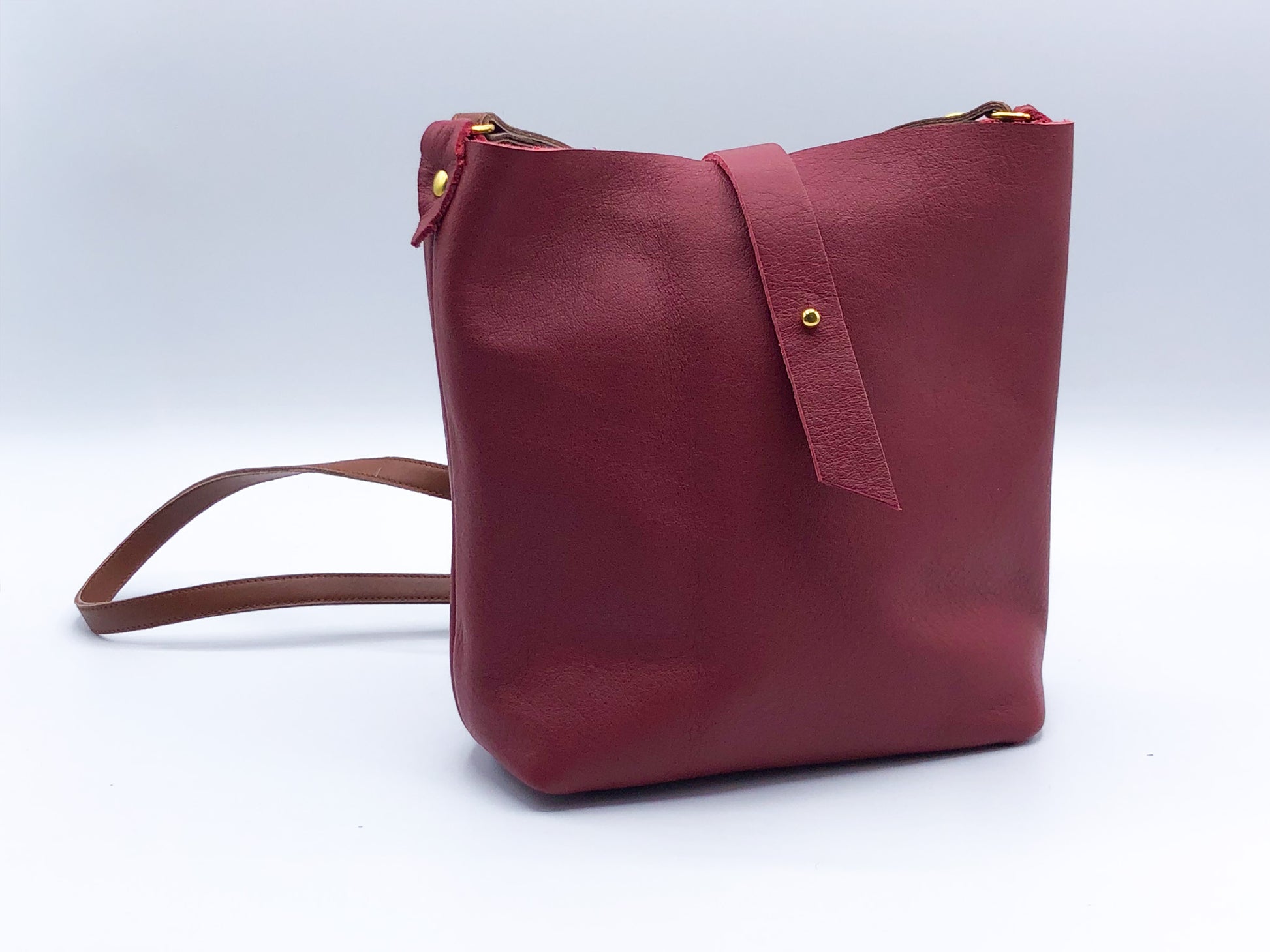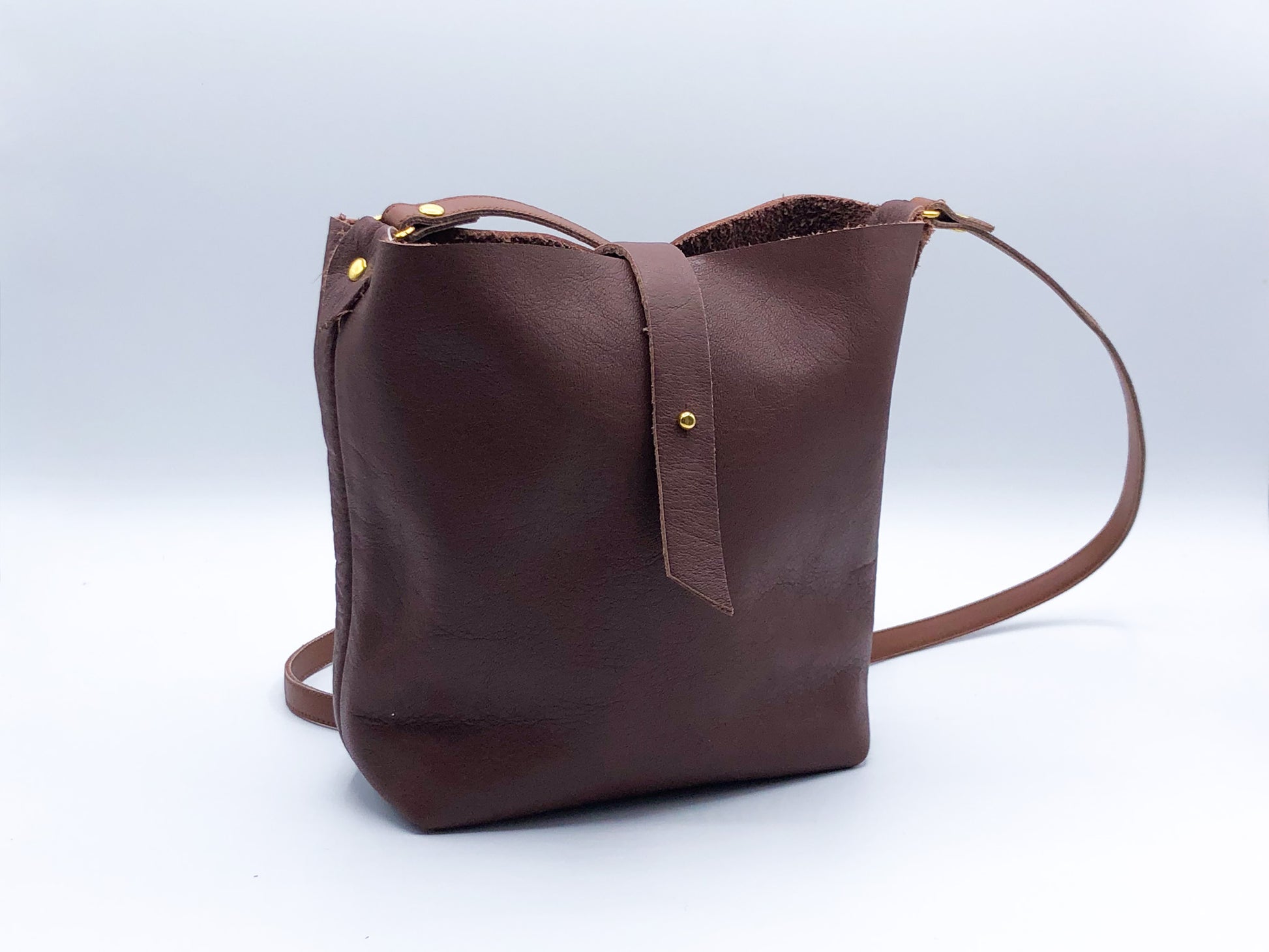 Borsa a tracolla semplice e minimale in nappa morbidissima sfoderata. Ha una tracolla in cuoio marrone e una chiusura fermata da un gemello.