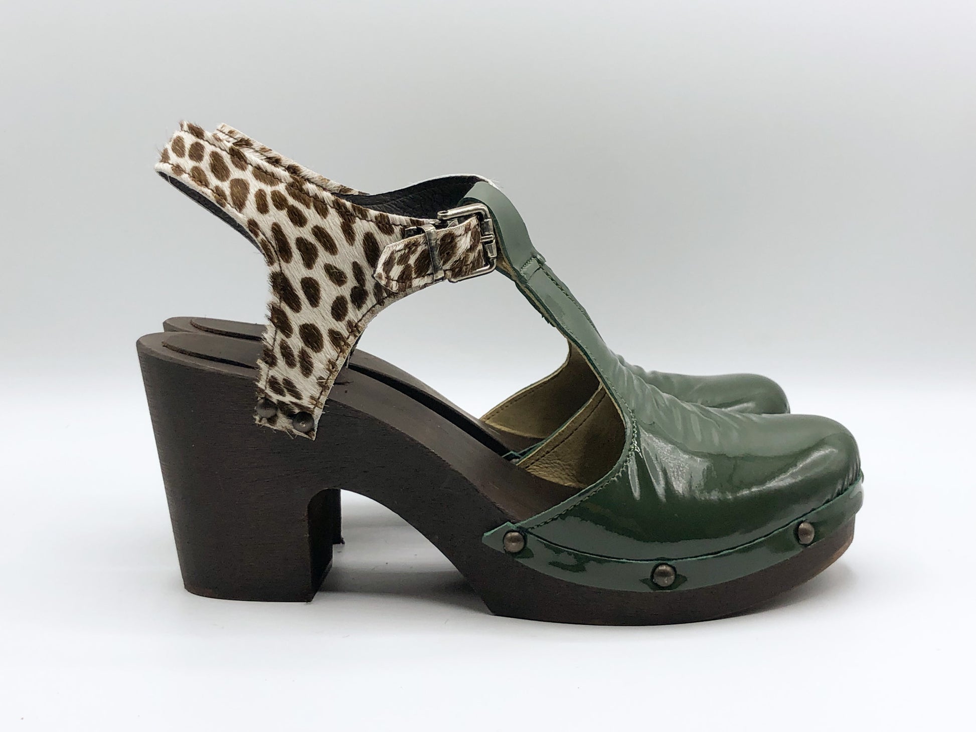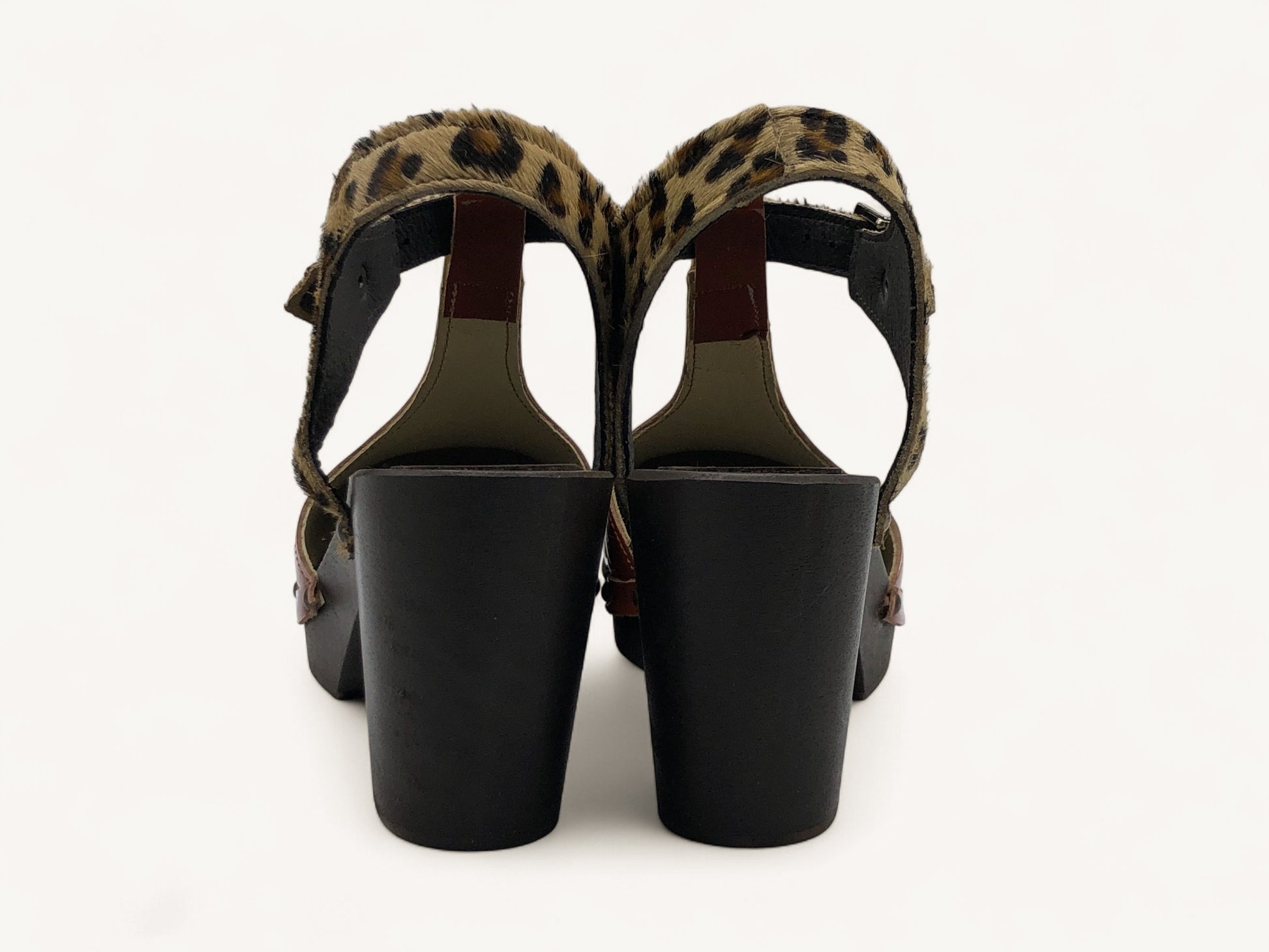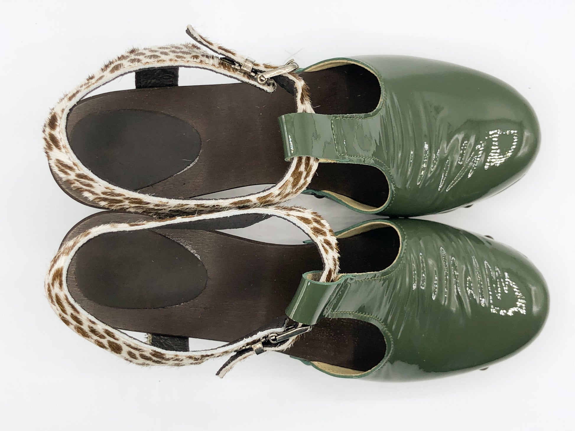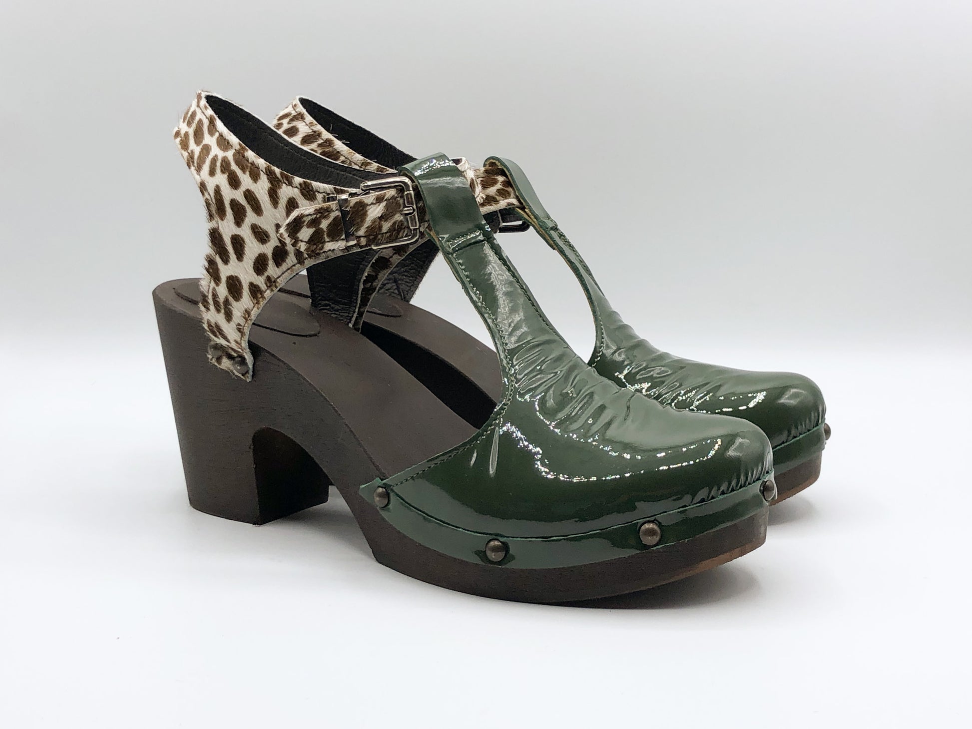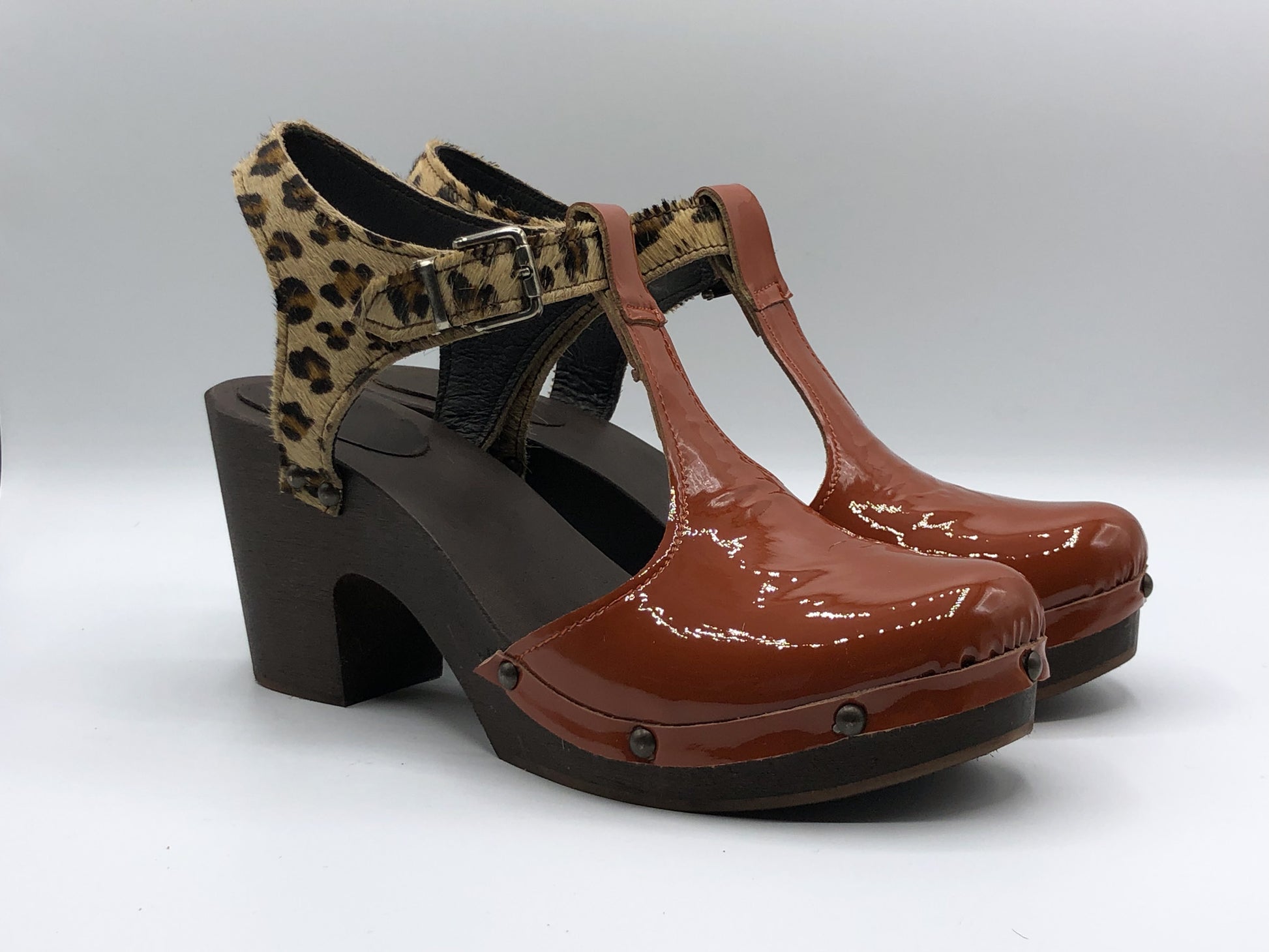 Il modello Susy T ha una fascia avvolgente che arriva fino alla caviglia dove si collega al laccino. La base è in legno color cioccolato. La tomaia può essere monocolore o bicolore e si può giocare con gli abbinamenti e i materiali. Qua la proponiamo in vernice e cavallino o cavallino e cuoio ingrassato.